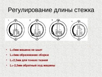 Setting the stitch length on PMZ sewing machines is carried out in the range from 1 to 4 mm. The regulator is located on the front panel and looks like a lever moving along the scale up and down. A scale with numbers equal to the desired width parameters, has a gradation of 0.5 mm, provides accurate control over the pitch of the needle.