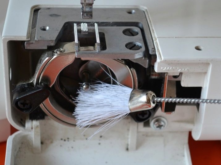 For long-term operation, any sewing machine accumulates thread trimming inside, scraps of fabric. To remove them, remove all parts that do not require complex dismantling. You can remove the presser foot, needle, needle plate, front panel and hook. To clean the mechanism inside, a toothbrush is suitable. A clogged shuttle will not allow the machine to sew normally, the needle will jam.
