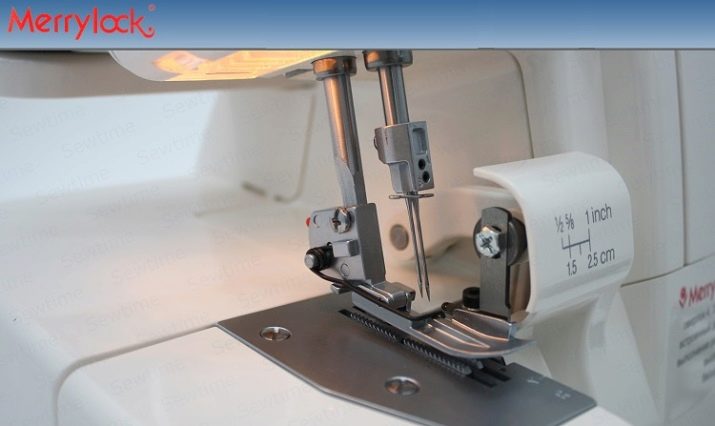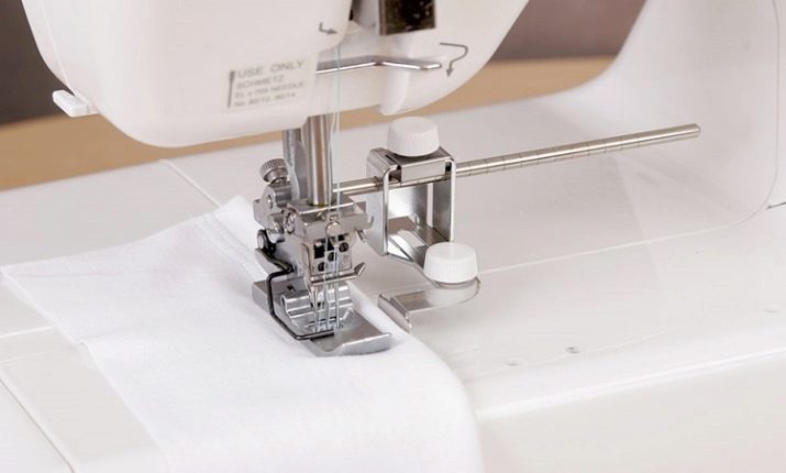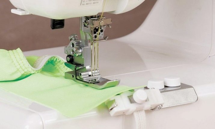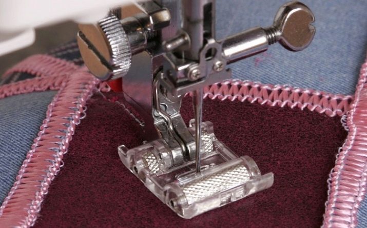 As part of such a foot there is a cutting element that trim the edge before subsequent sewing. When sewing, you need to follow so that the edge of the fabric fits snugly against the guide.