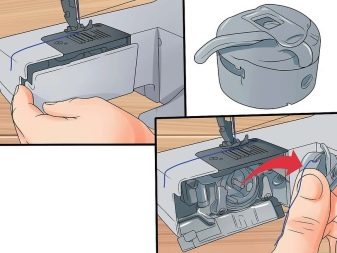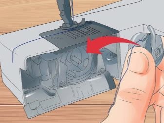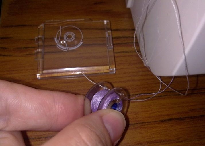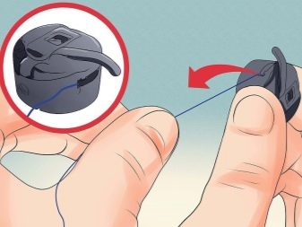 Now you need to insert the bobbin. To do this, the cover is removed and the bobbin case is removed, just pull on the tip. Insert the spool into the cap so that the thread is clockwise. The tail of the thread should be led through the slot to the end, the tip should stick out at least 10 cm. Insert the shuttle back into the nest. If the bobbin is horizontal, then the cap is not provided.