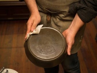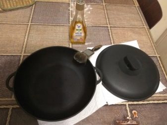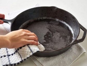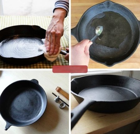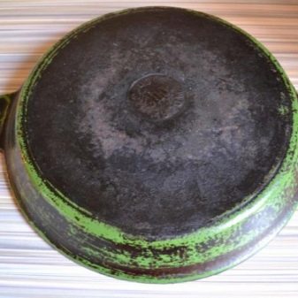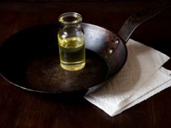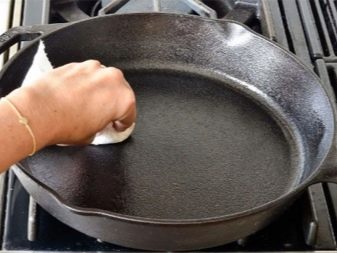 In the process of calcining the pan, the hostess's primary task is to treat her with oil, which when heated penetrates the pores and remains there.If the pan does not have cracks, then even old dishes can be put in order. First, rust is removed from its surface, then the cast iron is heated and sunflower oil is applied to it. The dishes are allowed to cool.