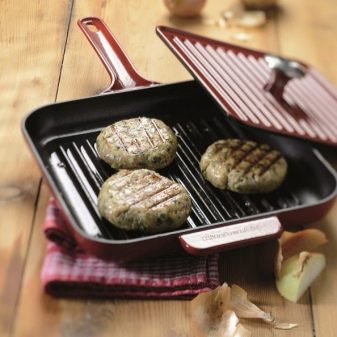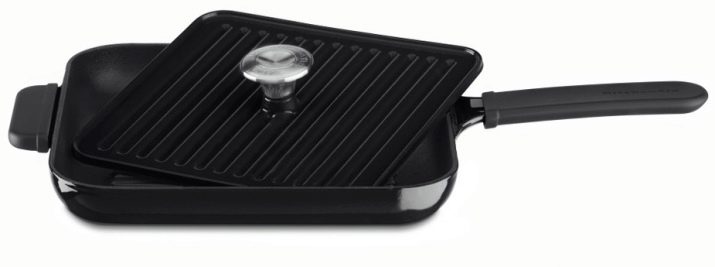 - "KitchenAid KCI10GPOB." A grill pan is a non-standard solution for those who are accustomed to quickly organize a picnic. The set includes silicone handles. This material does not heat up even if you put the dishes in the oven. Comes on sale with a cover press. On sale can be found in three colors. Of the advantages, high-quality enamel can be distinguished, the ability to use on any plate. You can install the dishes in the oven, heated to a temperature of 250 degrees. The disadvantages of the model are its large weight and cost.