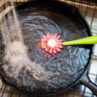 Regular prevention is the first thing you should pay attention to a caring hostess. After cooking, the pan will need to be thoroughly cleaned of food debris. Cast iron is known for the fact that food gets into its pores when exposed to temperature, as a result there is an odor that you need to be able to get rid of correctly.