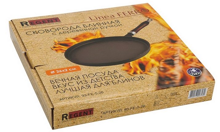 - "Regent Inox Linea Ferro". Pancake pan, which has standard two-centimeter sides and a diameter of 260 mm. The handle is made of wood, if necessary, it can be easily removed. If necessary, the pan acts as a baking dish, equipped with an induction bottom. The model is ignited in production, so you can immediately begin cooking your favorite dishes immediately after purchasing it. This is a rather heavy product weighing 2.6 kilograms, so cooking pancakes on it is better with a spatula.