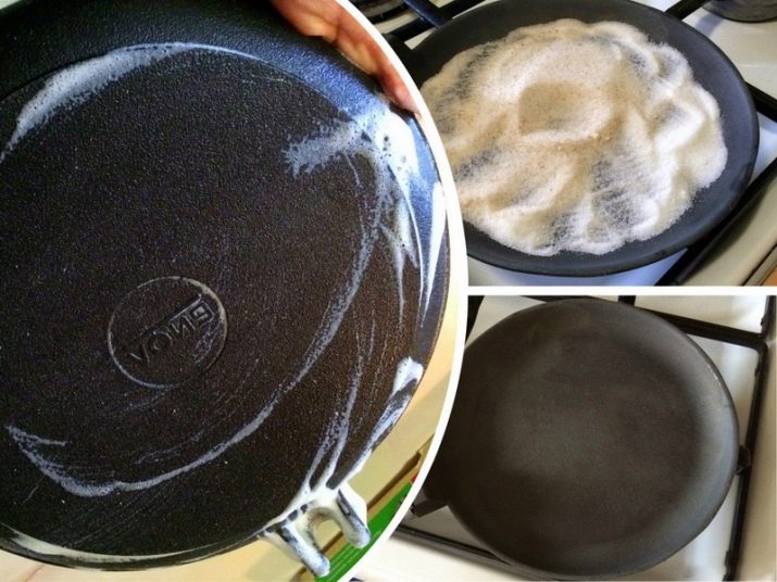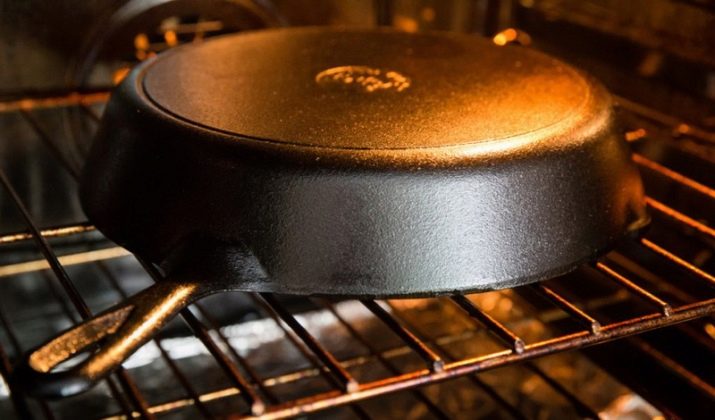 For calcination, you can use ordinary table salt or vegetable oil. If the first option is used, then you will need to pour a thick layer of salt in the pan and put it on a small fire.When the pan is completely cast iron, without a protective coating or plastic inserts, it can be placed in the oven. Models with a protective layer are not calcined.