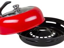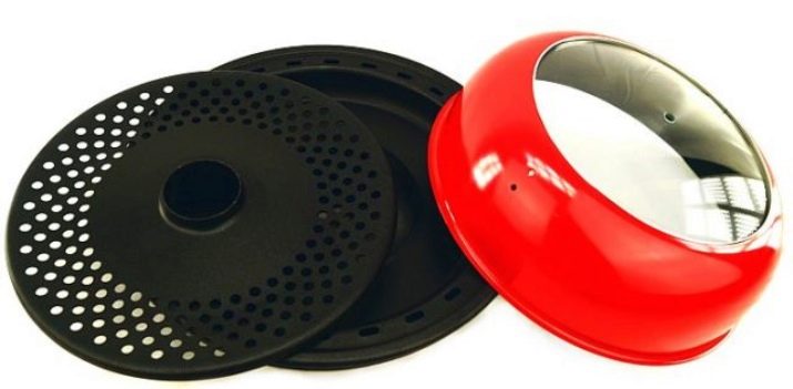 This device is somewhat reminiscent of such an aggregate as an air grill. The convection principle of hot air masses is the cornerstone of both, that is, hot air currents, being heated by gas, rise and, passing through the grill, under the cover, change direction in the opposite direction. And the products located between the pallet and the lid are processed with high temperature. It is important that here the steam does not accumulate inside, as happens on ordinary pans, but passes through special holes located on the sides. This allows cooking without carcinogens. But more about that below.