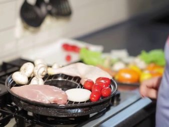 The pan of the described type can be used for cooking various products: meat, fish and vegetables. At the same time, you can not only fry, but also bake in foil, as well as bake various dishes, that is, it is universal. In addition, this cooking method allows you to save all the useful substances in it and will guarantee the absence of various kinds of carcinogens, as mentioned above.