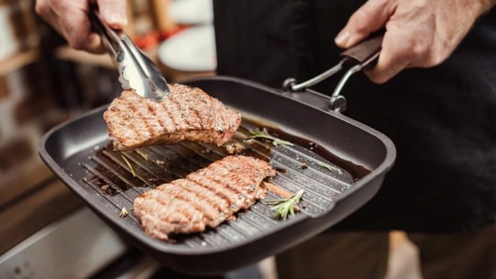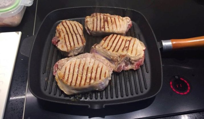 Before cooking, the grill pan will have to be heated very much. Even if the burner or burner is working intensively, you must wait at least 5 minutes. Then the surface will warm evenly, and the cooking process will go uniformly. Even with strong heating, the characteristic traces of the ribs become clearer. If steaks, coarsely chopped chicken or something similar are fried, the distance between the pieces should be approximately 1.25 cm.