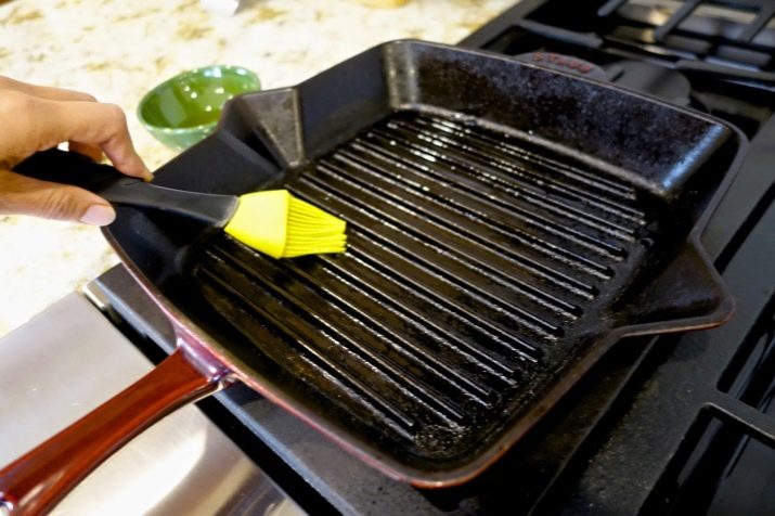 An important feature of the grill pan is its efficiency. To fry food you will need a very small amount of sunflower or olive oil. In some cases, they do without it at all. And if they do, then some cooks moisten the convex parts with a silicone brush, while others spray the product itself.