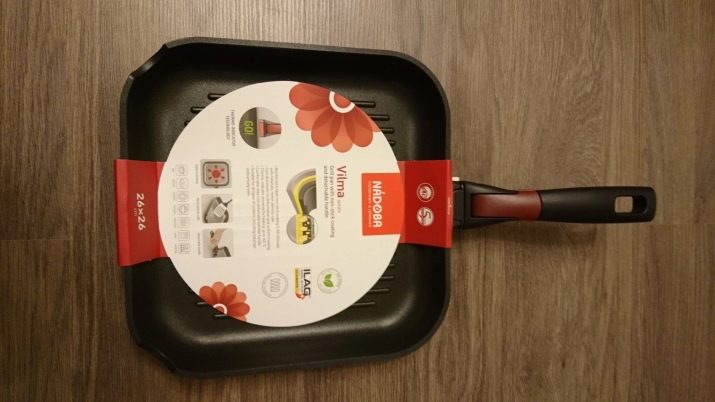 - The next interesting version is the Nadoba Vilma 728220. This is a square frying pan equipped with a heating indicator.Czech developers have provided recesses for draining the liquid, placed at the edges, and not from the side, as usual. The handle is equipped with a thermochromic indicator. It accurately shows when the dishes are warmed up and you can start work.