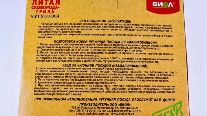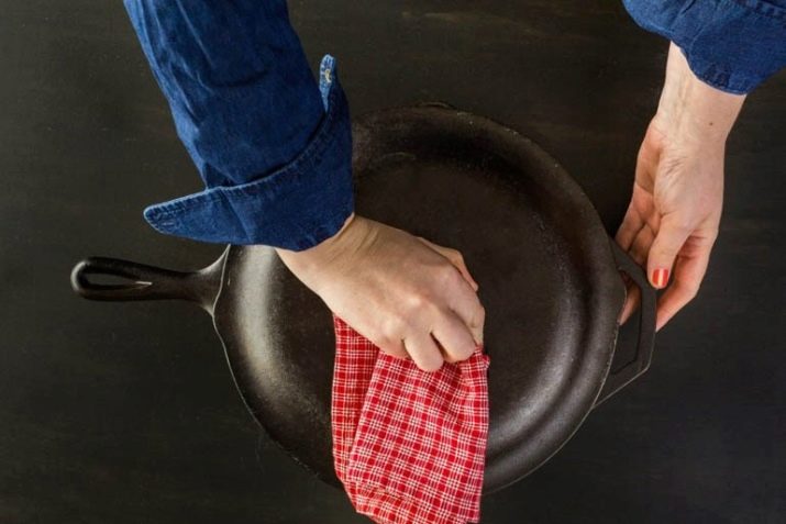 If you need to store a cast-iron frying pan without use, it is carefully covered with sunflower oil (use a paper towel for this). Then put the dishes on the middle shelf in the oven and set the temperature to 190 degrees. After keeping the pan in this mode for 60 minutes, the heating is turned off, and then they wait until it cools down.