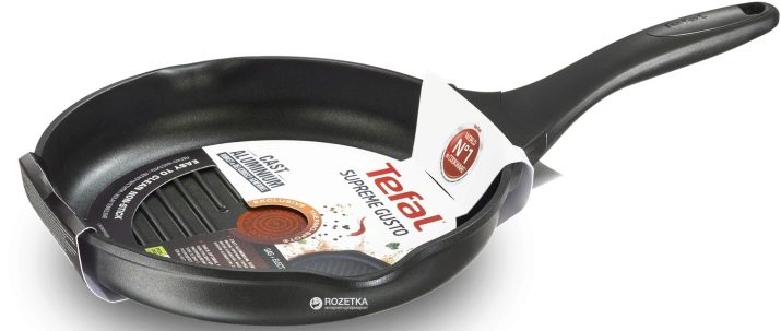- French company Tefal It has been engaged in the production of grill pans for a long time. In the stores of this company models of different shapes and sizes are presented. The products are made from high quality raw materials. In production, aluminum is used, which has a high service life. Such models are suitable for cooking on electric and gas stoves. The average price of Tefal products is from 3,500 rubles.
