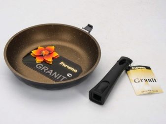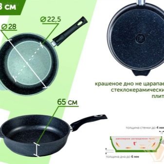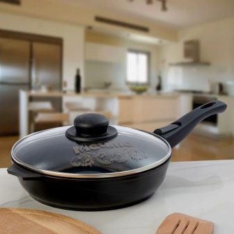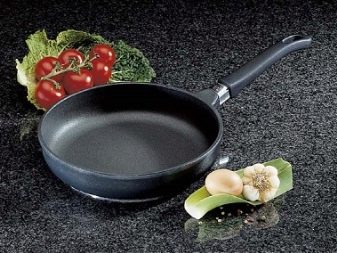 - Pans. Manufacturers produce such dishes with various sizes - the diameter of the pan varies from 20 to 30 cm. They can also be with fixed or removable handles, a thick bottom and walls, with glass lids in the kit or without them. They are made of aluminum alloy, providing slow food stew without burning. Suitable for cooking meat, fish and vegetables with a minimum amount of oil, while maintaining all the taste qualities of dishes.