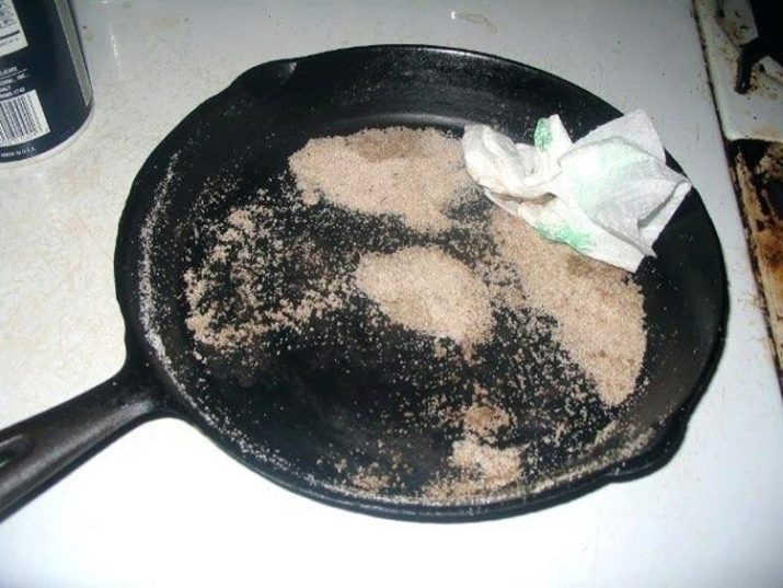 The cast iron skillet must first be cleaned with salt and oil. When you complete the cleaning procedure and wipe the cooled dish with a dry cloth, you need to grease the surface with oil again.