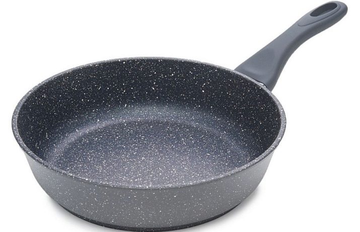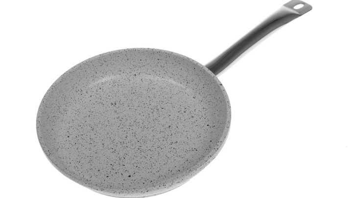 - Granite with aluminum coating. A universal pan that can be washed in a dishwasher. The handle is plastic, fastened with 2 screws. The model is not intended for use in a microwave or oven. During cooking, you do not need a lot of oil, which makes the diet and healthy dishes.