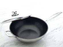 - 36 cm wok pan. Distinctive features are a narrow bottom and wide side walls, that is, a shape that expands from the bottom up. The bottom of the dishes is thickened, warms up quickly and evenly. Convenient to use. Equipped with two unheated handles.