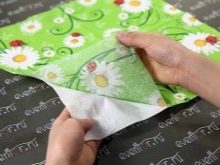 The paper towel is gently smoothed with an iron and the upper color layer is separated. A plastic wrap is glued onto the cardboard, a napkin is put on it and ironed with a hot iron (it is recommended to put the “cotton” mode or three-piece).