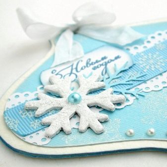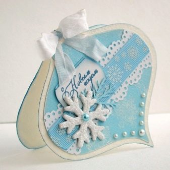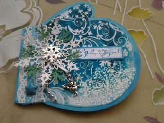 This is a very recognizable image associated with winter, and therefore incredibly popular. If you want to present a non-trivial postcard to the holiday, then this is an excellent choice. You can create a template by outlining mittens, hands. You can also draw a mittens in any shape, of any size, using a ready-made template. When choosing a size, think over which elements will be included in the composition so that everyone has enough space. To create such a card will not require special skills. You can sew the mittens with stitches, for example, on a typewriter or with your hands. Do not overload the mittens with decor, in any case it will be incredibly attractive. The mittens can be either double or ordinary, you can think of a pendant or the ability to put on the table.