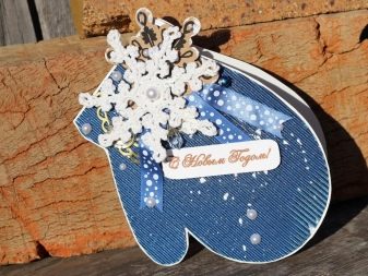 Do not be afraid to combine different elements, techniques and ideas. Greeting card mittens decorated with a snowflake - a very original design.