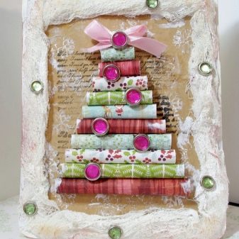 - Christmas tree. To create this decoration, any paper of suitable subjects is useful. You can make a lot of scrap-trees from all the remaining paper, for example. Christmas trees are made in different ways: in a fan-like manner; they are collected from snowflakes and other figured decor. It all depends on your imagination!