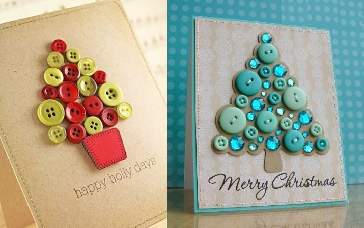 Do not be afraid to combine a variety of elements and techniques. A snowman with buttons, a Christmas tree of beads can be placed on different postcards or connected in one ensemble. Christmas trees made of colored pencils of different sizes look incredibly original.