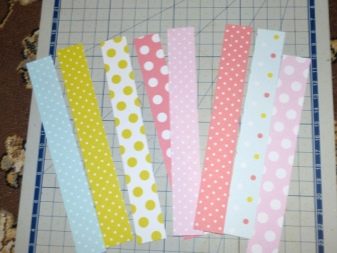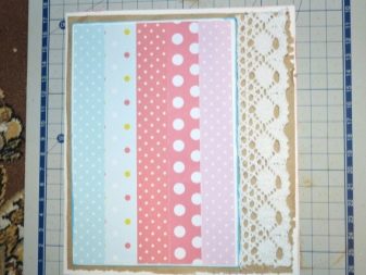 - Attach the ruler to the workpiece and draw along it with the back of the clerical knife, without pressing hard. So you can get the fold line. Glue strips of pre-cut scrap paper on the prepared basis in the appropriate color scheme. Glue a strip of lace on the right side.