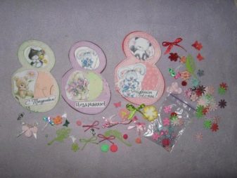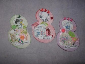 Also cards can be of a certain form: triangular, round, oval or in the form of number. The last option is often applied to the holiday on March 8, accompanied by spring colors: green and pink, gluing flowers. And as a photo, images of nature or the most vivid photographs of a lady are used.