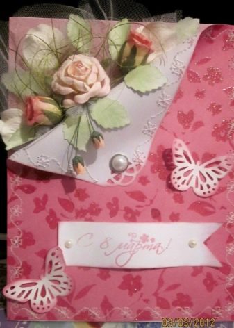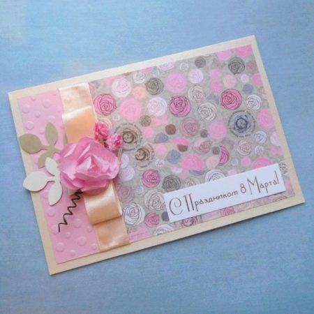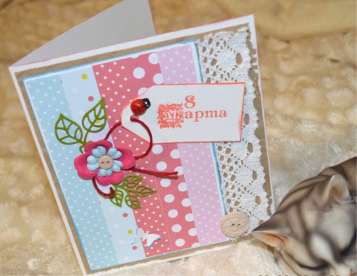On March 8, men often give cards, but usually they buy ready-made versions with a written poem or words of wishes. However, girls are much more pleased to receive a do-it-yourself surprise. Cards made using the scrapbooking technique are ideal for this case - such a present just does not want to redo anyone.