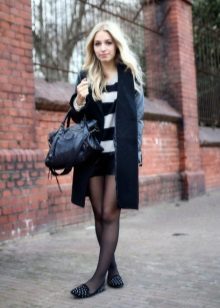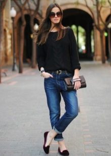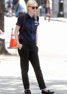 If you combine slippers with a more feminine outfit, then black shoes with a short flared skirt and a light blouse will be a win-win option. A laconic belt with a large buckle will successfully complete the image.
