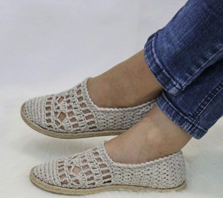 Handmade lovers did not lag behind fashion and began to create street slippers, armed with threads and crochet for knitting. To give homemade shoes stability it was knitted from linen or cotton. Despite the fact that they are created manually, the masters repeat all the design features of sleepers: a rounded, slightly elongated toe, a convenient backdrop are tied out. They fit perfectly into the wardrobe for a summer vacation and will surely appeal to fans of the boho or hippie style.