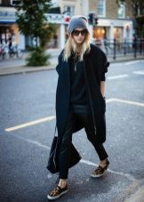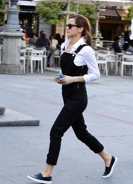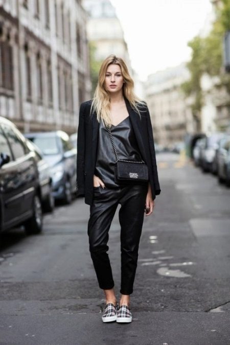 A black jumpsuit, along with a white shirt and black slip-on sneakers with thick white soles is another trendy outfit. Leather shoes in this case will look better than fabric.
