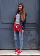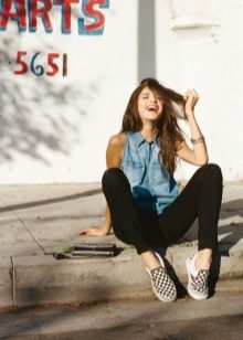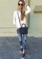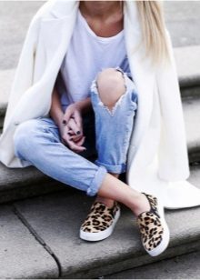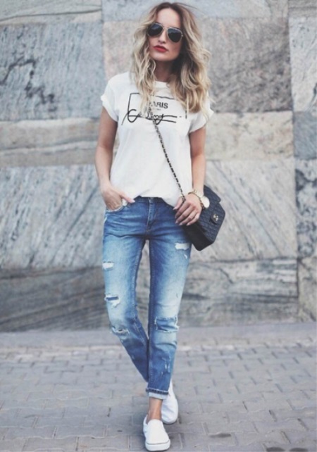 Being mainly sports shoes, slip-ons go well with jeans. Skinny and ripped jeans are at the top of preferences. The combination of a free T-shirt, tucked-up buggy jeans and slip-ons looks very nice. At the same time, great attention should be paid to the combination of the color of the top and shoes. Even with this sporty look, small handbags will become a bright and unusual addition.