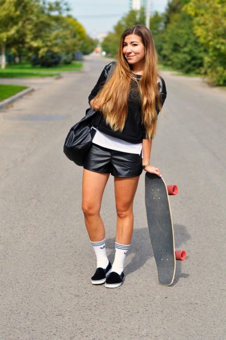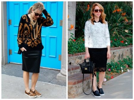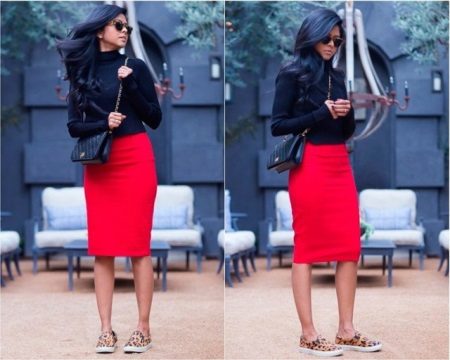 Not only trousers, but also skirts are an exquisite part of a beautiful image. Any skirts, from mini to midi, are suitable for slips. The combination of red and black colors with leopard slips looks gorgeous. The white top and dark bottom in combination with black shoes will ideally fit into the daily routine of both the schoolgirl and the business woman.