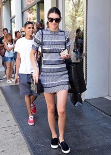 - Fashionable women have long been fond of marine style. Striped dresses look beautiful with light shoes. Slip-ons will come just in time, you get an image saturated with resort romance.