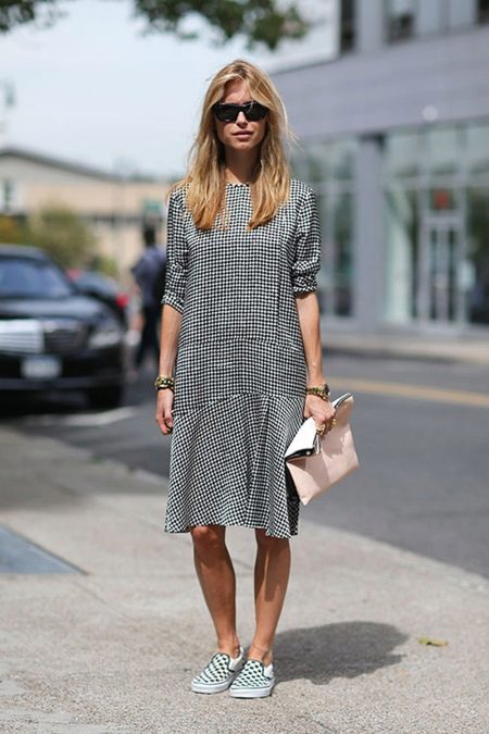 Slip-ons with a dress are a rather specific combination for most girls. Someone considers this unacceptable, someone will try, and some will become fans of the image.