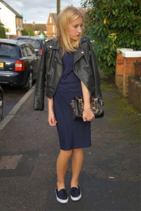 A simple dress with a black jacket is perfectly complemented by dark slips, creating a laid-back and slightly rebellious bow. In this outfit, you can safely go to a party, to the movies, to shops, to meet friends in a cafe. Both massive accessories and exquisite jewelry are allowed, which will slightly smooth the rough appearance of a leather jacket.