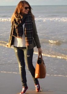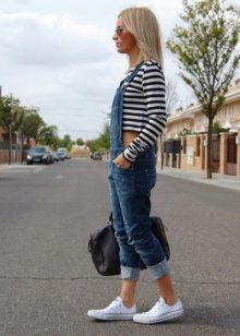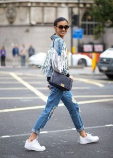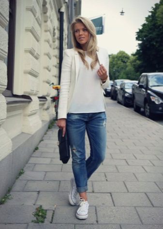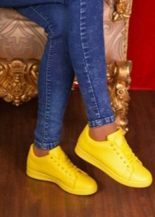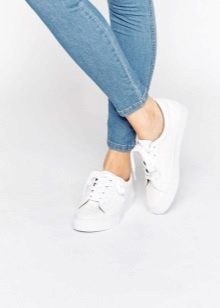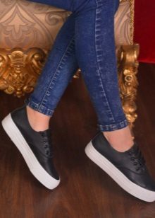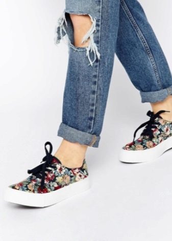 Lace-up slip-ons combine wonderfully with jeans and a regular t-shirt. Moreover, if the jeans are of a traditional color, then the shoes can be worn bright, with catchy ornaments or decor made of pebbles and metal. Slip-ons can have a high platform or, on the contrary, a flat sole.