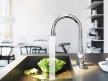 For kitchens, vertically standing taps mounted on the sink are often used. In rare cases, wall models are used. The main difference between the kitchen modification is the height and shape of the gander. These parameters are calculated taking into account the achievement of the necessary functionality.