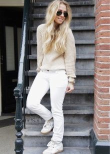 White sneakers can be combined with clothes of light and dark colors. White models are not inferior in popularity to black sneakers. They can be safely worn with your favorite jeans. White shoes go well with black leggings or trousers.