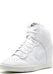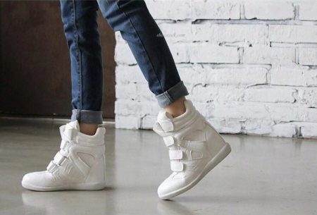 To embody a spectacular look, you need to look at suede models. White sneakers are very whimsical to care for. In bad rainy weather they should not be worn at all. They are ideal for creating solemn evening bows.