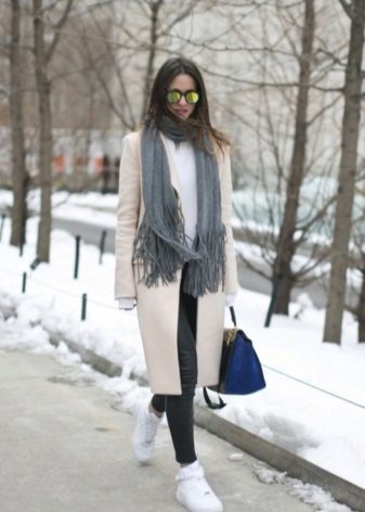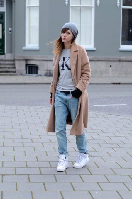 In the fall season, white sneakers can be combined with a coat. Today, the trend is a beige trench coat that looks perfect in tandem with snow-white shoes.