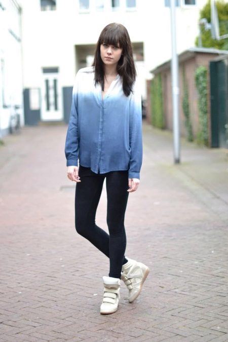 Many girls prefer urban style clothing. And here, white sneakers will become indispensable. They can be safely combined with leggings and a stylish gradient shirt.