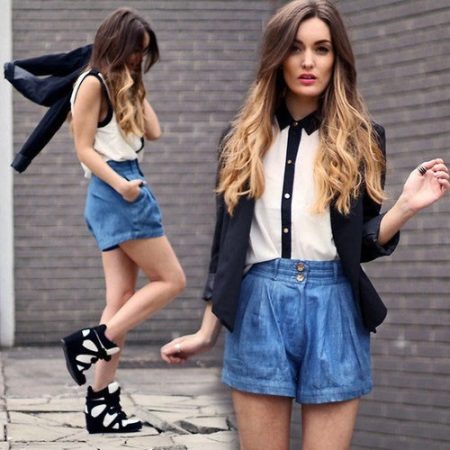If you want to emphasize the play of colors, then you can wear denim shorts in combination with a light blouse and a jacket.