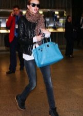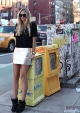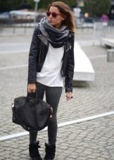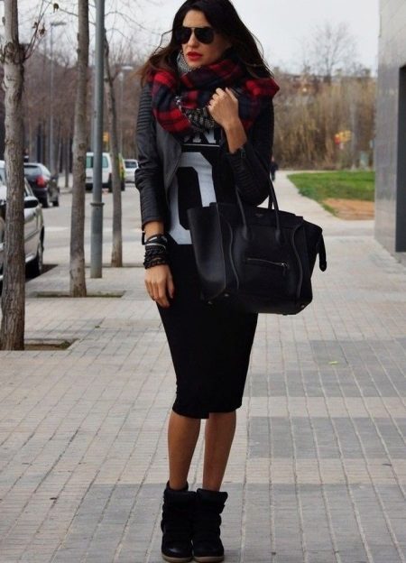 A combination of black sneakers with a skirt of a fitting cut of length slightly below the knee looks feminine and romantic. A black leather jacket over a black sweater with a white print will add harmony to the look. A long check scarf will become a bright accessory of a stylish bow.