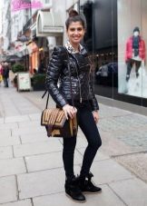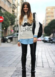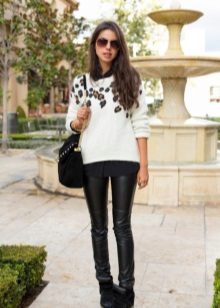 Do not forget about leggings and jeggings in combination with an elongated sweater or tunic. The final touch is black sneakers. Leather pants, a bright top, and black sneakers with rhinestones are ideal for a stylish party.