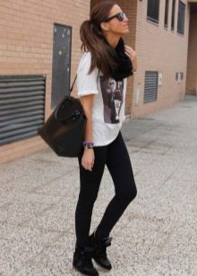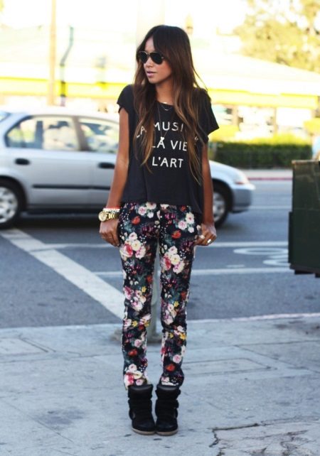 For the realization of a bright youth bow, black wedge sneakers should be combined with black trousers decorated with a floral print, and a black t-shirt and a white inscription.