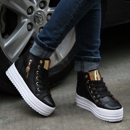 Models on a flat platform are suitable for sports. To create a stylish everyday look, you should pay attention to sneakers on a wedge, which gives the shoes femininity and elegance. They allow you to visually lengthen the silhouette, give a figure of harmony.
