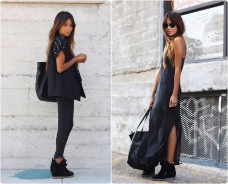 Black sneakers can be combined with different wardrobe items, since they are universal. They will help to create effective bows in a street style, but they should not be combined with clothes of a classic or business style.