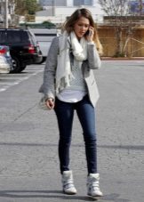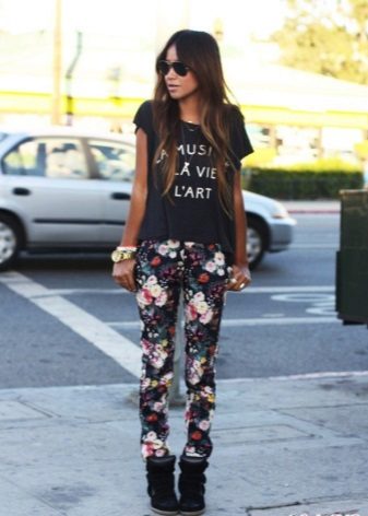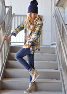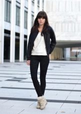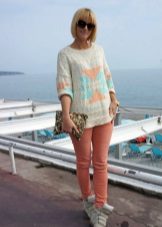 So, for example, classic skinny pants, from costume fabric, look very successful with dark sneakers. The same can be said about skinny jeans or models with gates that accept a much wider color range of shoes.