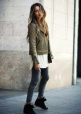 Urban style can be not just something familiar and, in some cases, dull. The outfit consists of narrow blue jeans, a white T-shirt, worn over it with a light blue denim shirt, and a creamy cropped leather jacket. Such a stylish look needs a worthy addition, so you should opt for a large bag of coffee color with milk and incredibly cool sneakers made of high-quality suede in light beige color.